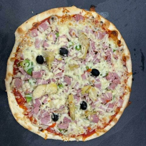 Tomate, fromage, origans, oignons, poivrons, olives, jambon, artichauts, crème fraîche