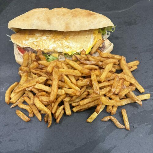 Steak 100g, cheddar, oeuf, salade, tomates, oignons, sauce au choix