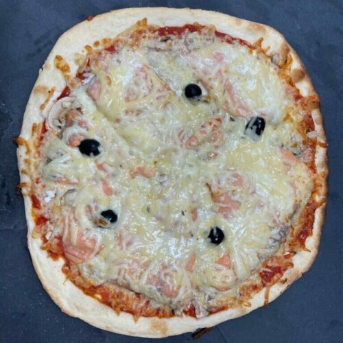 Tomate, fromage, origan, champignons, olive, saumon, crème fraîche