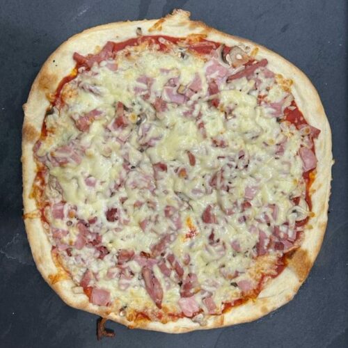 Tomate, fromage, champignons, jambon, lardons, crème fraîche